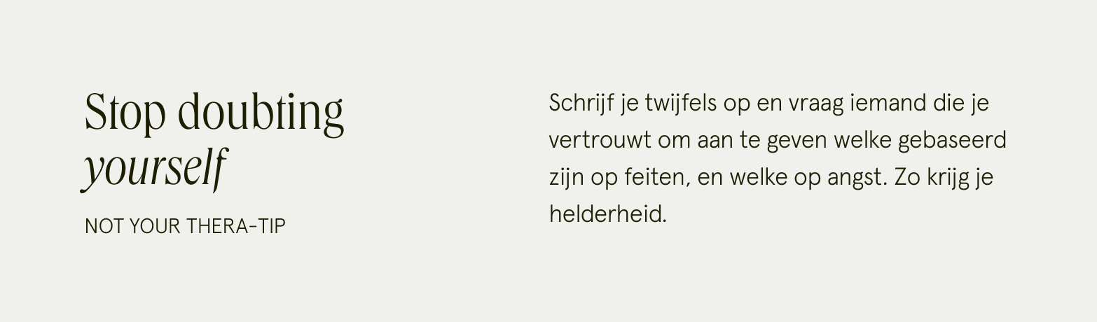Realistische twijfels voelen rustig en nuchter aan. Je denkt dan bijvoorbeeld: ‘Is deze nieuwe richting financieel haalbaar?’ of ‘Past dit bij mijn werk-privébalans?’